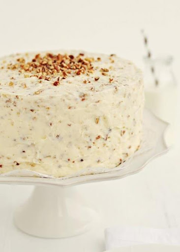 2. Cover the stacked cake with the remaining icing and top with remaining chopped pecans.