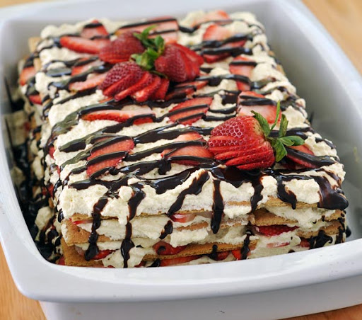 Spread a small spoonful of whipped cream on the bottom of a 9×13 inch baking pan, or a similarly-sized platter. Lay down six graham crackers. Lightly cover the top of the graham crackers with more whipped cream, and then a single layer of strawberries. Repeat three times, until you have four layers of graham crackers. Spread the last of the whipped cream over the top and swirl it lightly with a spoon. Add a few more strawberries.