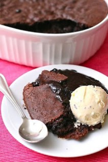 Pour the mixture into the prepared baking dish. Place the baking dish in a larger baking pan. Add very hot tap water to the outer baking pan to create a water pan, coming halfway up the side of the baking dish. Bake for 60 minutes. The center will appear very under-baked, that is the way the dessert should be. Allow to cool slightly before serving with ice cream.
