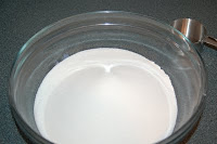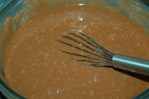Add 1 teaspoon of baking powder to milk mixture. Set aside. In a small bowl combine chocolate chips and 1 tablespoon of flour. Set aside.