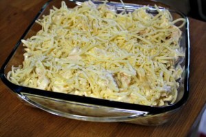 Place shredded potatoes or frozen (unthawed) hashbrowns in a 9×13 pan. Sprinkle with shredded cheese and stir lightly to combine.